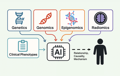 We develop AI‑powered frameworks that integrate genetics, genomics, epigenomics, radiomics, and clinical phenotypes at different scales. We build computational models to predict one modality given another, learn joint distribution, perform conditional inference, etc. Beyond association, our ultimate goal is to identify cross‑modal causal pathways (e.g., how exposures propagate through molecular layers to influence phenotypes).